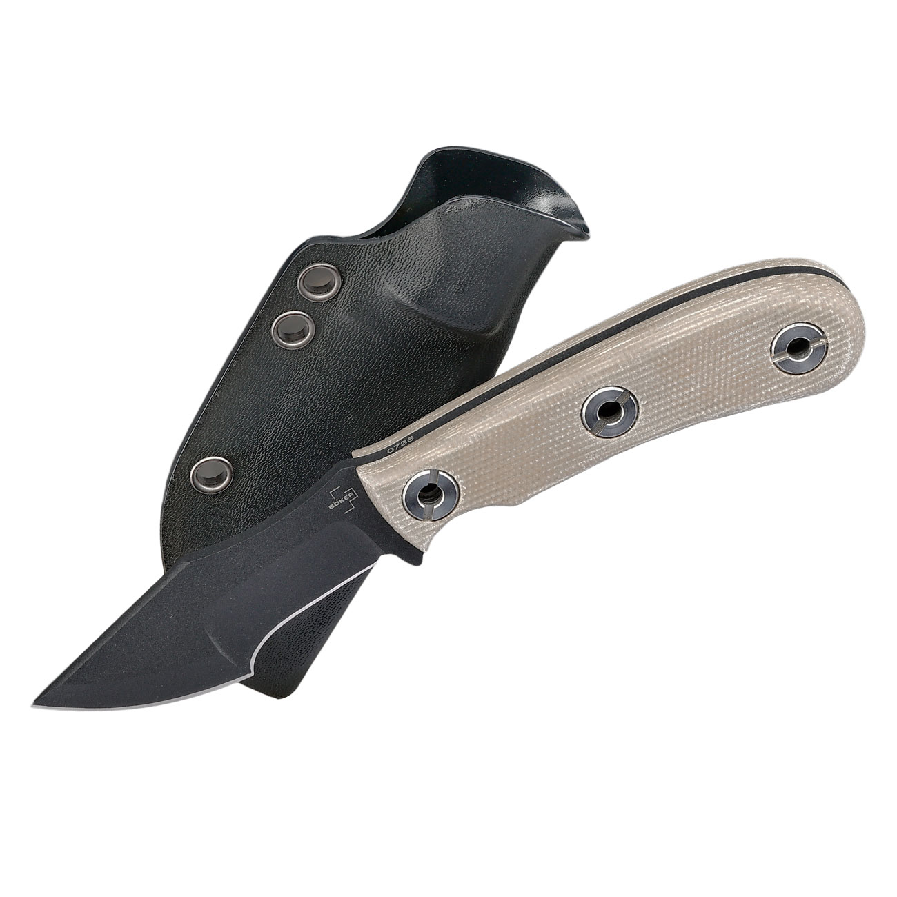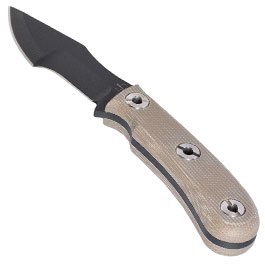 Die beiden ergonomischen Griffschalen verfügen über eine rutschfeste Oberfläche und sind mit markanten Hohlnieten verschraubt. Eine tiefe Fingermulde am Griff und auf dem Klingenrücken sorgen für maximale Präzision und Sicherheit beim engen führen der Klinge. Durch die Hohlnieten lassen sich Fangriemen oder Handschlaufen einfach befestigen.