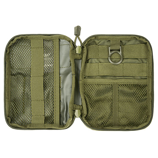 Auf der Vorderseite befinden sich mehrere Molle-Schlaufen und eine breite Klettfläche zum anbringen von Patches. Die hintere Seite der Tasche verfügt über diverse Molle-Schlaufen mit Druckknöpfen zur Befestigung an einem Rucksack oder anderer Ausrüstung. Mit dem seitlichen Tragegriff kann die Tasche auch einfach so mit der Hand getragen werden.
