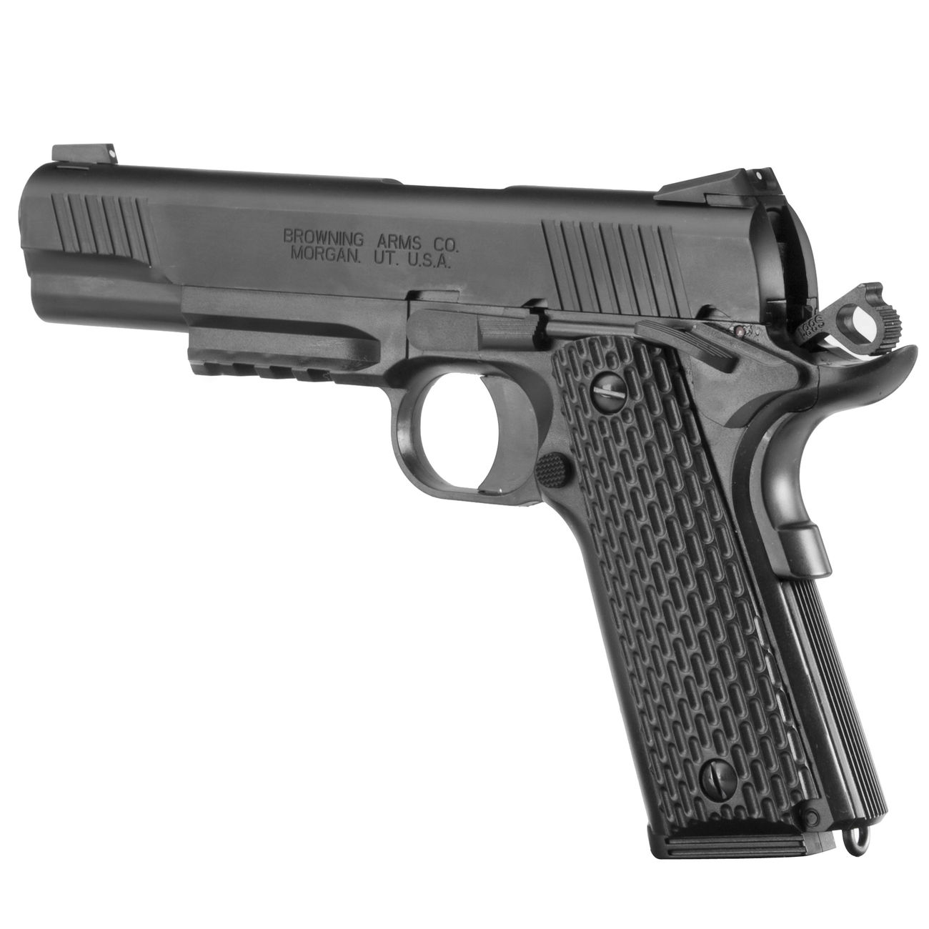 Stabiler und extra schwerer Nachbau aus schlagfesten Verbundkunststoff mit Metallschlitten im Maßstab 1/1 von Umarex. Dank der erworbenen Lizenz sind auf dem Schlitten sämtliche Originalmarkings eingraviert. Auch das interessante Browning-Logo befindet sich auf dem Schlitten. Die Griffschalen sind in einer speziellen Optik gehalten und vermitteln mit der Underbarrel-Rail einen taktischen Eindruck.