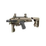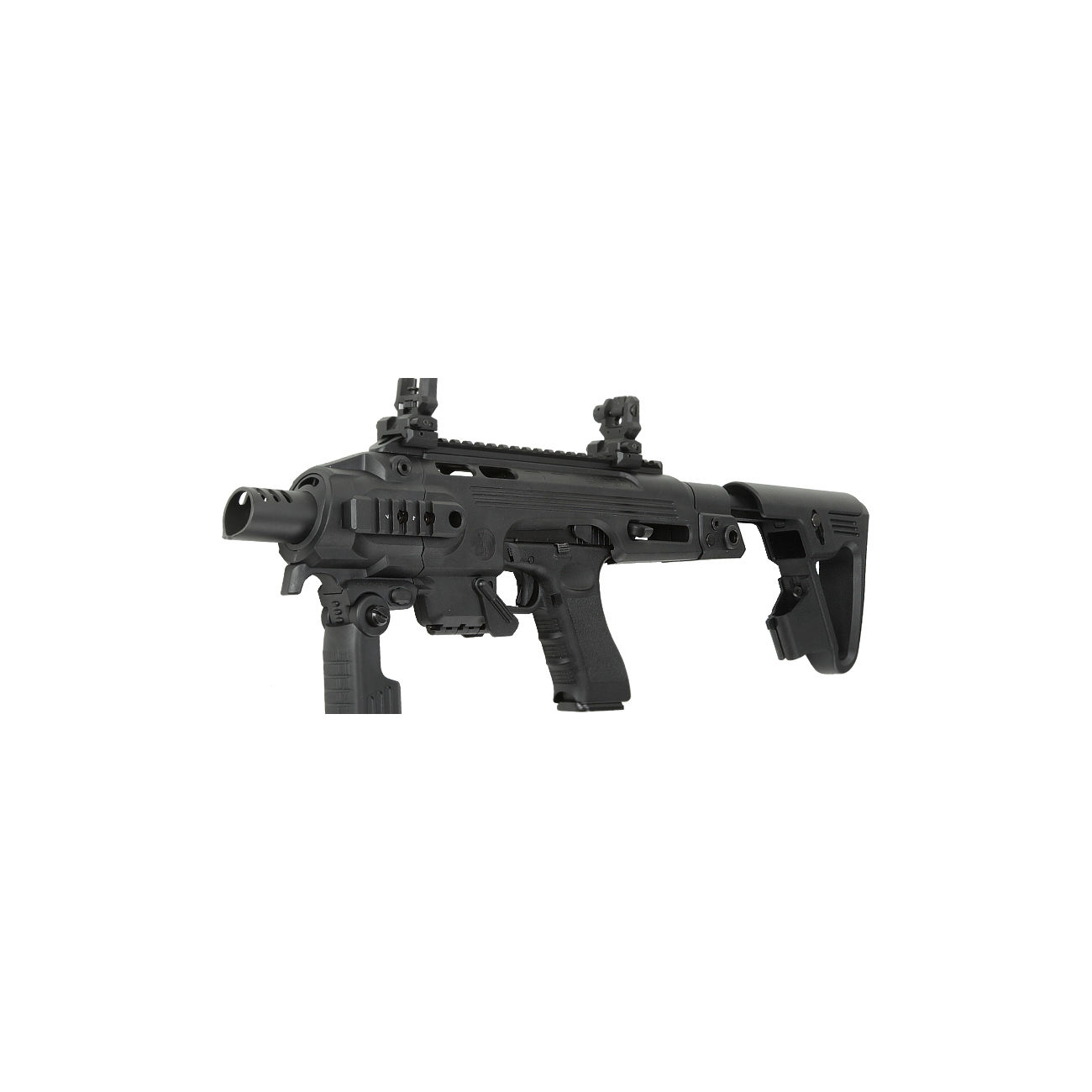 Wie bei einem Standard Carbine ist der Umbausatz mit einem 5-fach ausziehbarem Schaft ausgestattet, damit der Schütze das Pistol-Carbine perfekt anpassen kann. Ebenfalls ist der Schaft mit einer Ersatzmagazinhalterung versehen, die ein schnelleres Nachladen ermöglicht. Weiterhin kann die Wangenauflage um einen Zentimeter in der Höhe verstellt werden. Oberhalb des Carbines befindet sich eine 23cm lange 21mm Schiene auf der bereits ab Werk zwei CAA Flip-Up Visiere angebracht worden sind. Diese können je nach belieben verschoben oder abmontiert werden. Vorne sind links / rechts sowie unten je eine kurze 21mm Schiene montiert. Die untere ist bereits mit einem klappbaren Frontgriff versehen. Der große Flash-Hider an der Vorderseite besteht aus robustem Aluminium während der überwiegende Rest, wie beim Original, aus widerstandsfähigem Polymer-Kunststoff hergestellt ist.