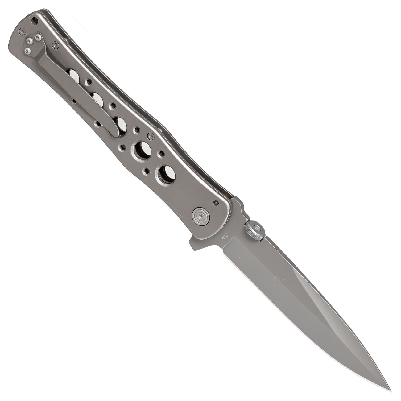 Die beiden verschraubten Griffstücke bestehen ebenfalls aus titanbeschichtetem Edelstahl. Der Griff mit ergonomischer Form besitzt kreisrunde Aussparungen um das Gewicht zu reduzieren. Das Messer lässt sich entweder über den Flipper oder geriffelten Daumenpin in Schraubenform öffnen. Die Klinge arretiert sicher im Linerlock.