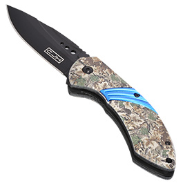 Das CJH Taschenmesser Camo kommt mit einer schwarz beschichteten Klinge aus rostfreiem 420er Stahl. Geöffnet wird diese mit beiden Händen und ist so nicht vom Führverbot betroffen. Der zuverlässige Linerlock Mechanismus sorgt für eine sichere Arretierung.