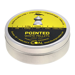 Die Pointed White Pellets von Coal sind für Luftdruckwaffen im Kaliber 4,5 mm geeignet. Sie sind hochpräzise und ideal für Hobby- oder Zielschießen geeignet. Die Spitzkopf-Diabolos erreichen eine hohe Geschwindigkeit und sind somit auch für weite Distanzen bis 50 Meter geeignet.