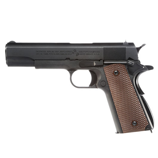 Präziser und stabiler Vollmetall Airsoftnachbau der Colt M1911A1 Army-Version Selbstladepistole von Cybergun bzw. AWC. Das Original gehört wohl zu den bekanntesten Pistolen weltweit. Bereits im Jahr 1911 wurde die Colt Pistole als US Dienstwaffe eingeführt und bis 1985 eingesetzt. Bis heute wurden von diesem Modell über 3 Millionen Stück gebaut und selbst die Ablöse durch die M92 im Jahr 1985, tat der Beliebtheit keinen Abbruch. Unsere Airsoftausführung überzeugt durch ein starkes Gas-Blow-Back Schussystem im Kaliber 6mm BB. Aber nicht nur diese Eigenschaft ist ein wichtiger Punkt dieser Airsoftpistole. Die Cybergun bzw. AWC Replika ist zusätzlich noch komplett von Colt lizenziert. Dies bedeutet, dass die Pistole mit sämtlichen, tief eingravierten Original-Markings der M1911A1 ausgestattet ist. Ein Detail das diesen Nachbau auch für Sammler sehr interessant macht.
