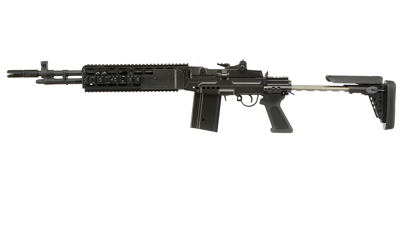 Bei der Metallgearbox handelt es sich um ein Reinforced Version 7 Modell (baugleich zur TM M14 Serie). Ausgestattet ist die Box mit Metalllagern, einem Standard Stahl Gear Set und einer Reinforced Tappet Plate. Um Gearjams vorzubeugen wird die Gearbox über einen High-Performance Motor aufgezogen. Bei diesem Gewehr handelt es sich um eine halbautomatische S-AEG im Kaliber 6mm BB mit einer Schussleistung bis zu ca. 1,5 Joule.