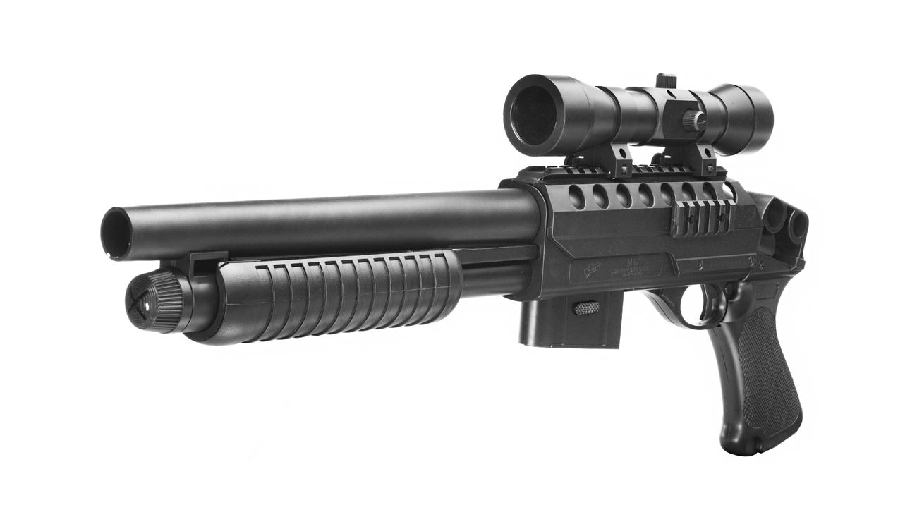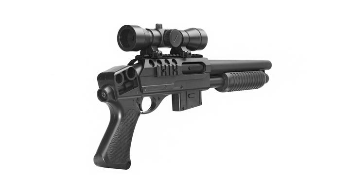 An der Oberseite ist eine 21mm Schiene im Hauptgehäuse integriert. Diese ist für die Montage des enthaltenen Zielgeräts mit Red-Cross (rotes Kreuz) Leuchtabsehen gedacht. Durch den Federdruckmechanismus kann die Shotgun sofort eingesetzt werden. Gespannt wird wie beim Original durch den vorderen Spanngriff.