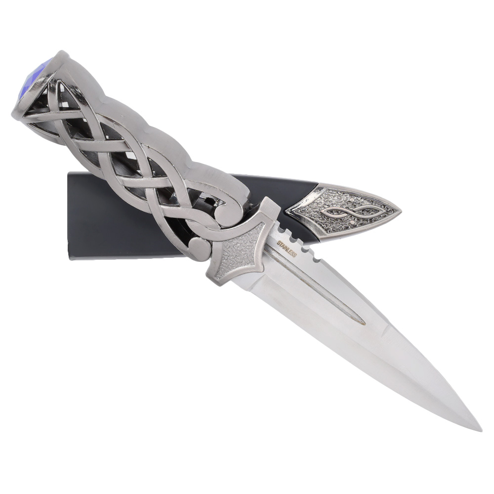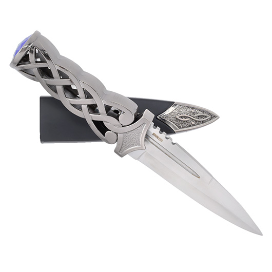 Der Schottische Dirk von Haller kommt mit einer rostfreien Stahlklinge inklusive robuster Scheide. Durch den schön geformte Skelettgriff aus Metall liegt der Dekodolch gut in der Hand. Zusätzlich besitzt er einen Dekostein auf dem Knauf. Der Beschlag auf der Kunststoffscheide ist ebenfalls aus Metall gefertigt und aufwändig verziert.