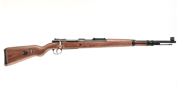 Das Highlight des Double Bell Karabiners ist aber natürlich der Schussmodus mit Hülsenauswurf. Der Nachbau kommt hier als Federdruck Bolt Action Version mit originalgetreu funktionierendem Spannmechanismus und Hülsenauswurf. Zuerst können wie beim Original bis zu 5 Patronen in die Patronenkammer eingeladen werden. Diese können einzeln oder mit einem zusätzlich erhältlichen Ladestreifen eingesetzt werden. Einfacher ist es natürlich mittels eines Ladestreifens. Anschließend muss der Verschluss bzw. Spannhebel wie beim echten Karabiner 98k nach hinten und wieder nach vorne bewegt werden um das Gewehr zu spannen. Hierdurch wird eine Patrone aus der Patronenkammer ins Patronenlager geladen. Wird nach dem Schießen der Spannhebel wieder zurück bewegt, wird die leere Patrone ausgeworfen und beim nach vorne bewegen, eine neue Patrone ins Lager eingelegt. Durch diese Funktionsweise kommt beim Schießen des Double Bell Karabiner 98K ein sehr authentisches Gefühl auf. Zusätzlich sorgen die vielen Metallteile im Innern für ein passendes Nachladegeräusch und eine zuverlässige Schussfunktion.