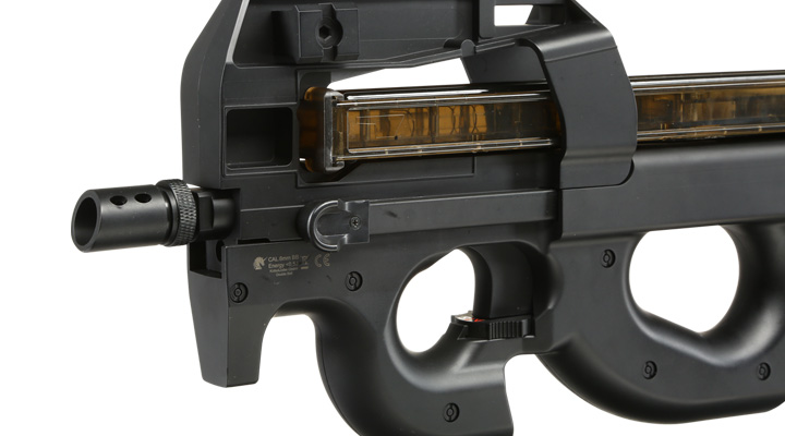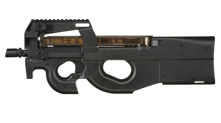 Originalgetreu ist das untere Hauptgehäuse mit Griffstück aus widerstandsfähigem Verbundkunststoff hergestellt. Durch die leicht raue Oberflächenbeschaffenheit und die spezielle Formgebung liegt die DB90 TR sehr gut im Anschlag. Oberhalb des Gehäuses befindet sich das typische Magazinfach. Hier wird auch bei der Double Bell Airsoftreplika das Magazin waagerecht eingelegt. Im Lieferumfang enthalten ist ein Hi-Cap Magazin für ca. 280 Schuss. Für noch mehr Realismus ist von Double Bell ein Low-Cap Magazin mit Patronenattrappen im Zubehör erhältlich. Dies steigert nochmals den Realitätsgrad und bringt das Airsoftmodell noch näher ans Original heran.