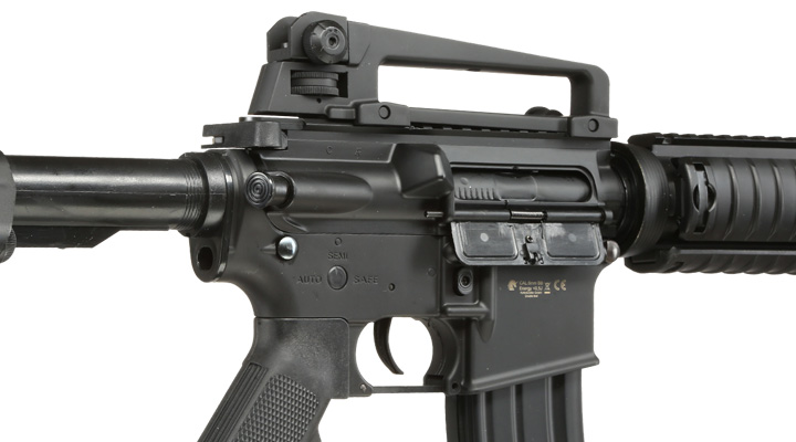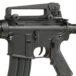 Beim Hauptgehäuse setzt Double Bell bei der Super Sportline Gewehrserie auf robusten Verbundkunststoff. Der graue Farbton sowie die Oberflächenbeschaffenheit sorgen für eine passende Optik und lassen den Gewehrnachbau sehr authentisch wirken. Das obere und untere Gehäuse wurden passgenau gefertigt, wodurch diese spielfrei aneinander liegen. Überzeugend sind auch die Beschlagteile am Gewehr. Neben einer passenden Montage wurde ebenfalls auf eine gute Verarbeitung geachtet. Über dem Gehäuse befindet sich der Standard M4A1 Carbine Tragegriff mit integrierter Visierung. Diese besitzt zwei Absehen und kann in der Höhe sowie seitlich eingestellt werden. Anstatt des Tragegriffs kann auch einfach ein anderes Zielgerät montiert werden. Hierzu muss einfach der Tragegriff mittels der zwei Hand-Muttern gelöst und vom oberen Gehäuse abgenommen werde. Die darunter befindliche 21mm Schiene eignet sich z. B. ideal für die Montage diverser Zielgeräte aus dem Zubehörmarkt. Der Griff im Standard M4A1-Design mit angerauten Flächen sorgt für einen sicheren Halt und ist aus ebenfalls Verbundkunststoff hergestellt.