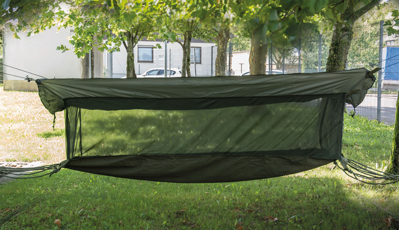 Spezial-Hängematte aus reißfestem 100% Nylon. Dach und Boden wasserdicht beschichtet. Mit 4 starken Seilen zur stabilen Befestigung an Bäumen etc. ausgestattet. Ringsum mit extrem feinmaschigem Moskitonetz verkleidet. Zum Öffnen dient ein unverwüstlicher Reißverschluss. Die Hängematte lässt sich am Boden natürlich auch als Einmannzelt verwenden. Der Innenraum ist völlig ausreichend für einen großen Mumienschlafsack. Farbe: oliv.