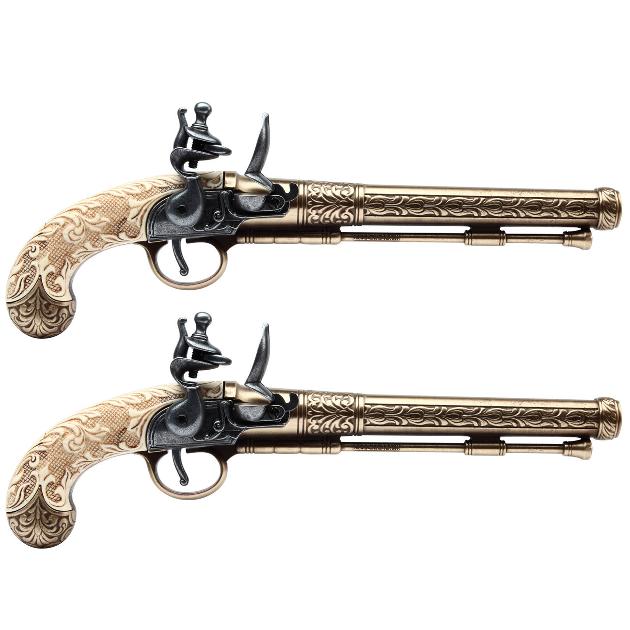 Schöne originalgetreue Nachbildung zweier Duellpistolen aus echten Metallteilen, wie sie schon bereits im 16. Jahrhundert benutzt wurden. Mit funktionstüchtigen Abzug und Steinschloss (Auslösemechanismus für Vorderladerwaffen).