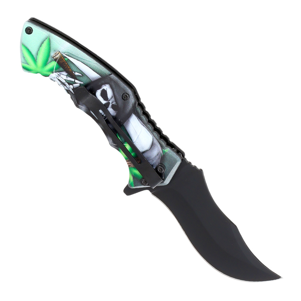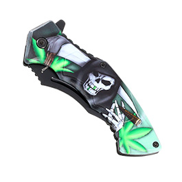 Das Death Joint Einhandmesser kommt mit geschwungener Klinge im auffälligen Skull-Design. Die schwarz beschichtete Klinge besteht aus rostfreiem Stahl und lässt sich dank Flipper oder alternativ per Nagelhau mit einer Hand öffnen. Die Arretierung erfolgt sicher per Liner-Lock.