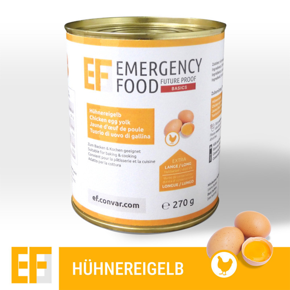 Das Hühnereigelb von Emergency Food kommt in einer Konservendose und eignet sich hervorragend als Notvorrat zu Hause. Dank der luftdicht verschlossenen Dose ist es ultralang haltbar und einfach zu lagern.