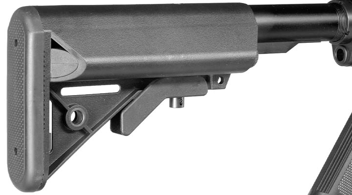 Die Stock-Tube wurde aus haltbarem Aluminium gefertigt und besitzt 4 Einrastpositionen, damit der Schütze das Gewehr in der Länge anpassen kann. Wie beim echten Gewehr besteht der Crane-Stock Schiebeschaft aus Polymer-Verbundkunststoff und ist dadurch äußerst robust. Die Schaftkappe ist aus Gummimaterial gefertigt und wirkt rutschhemmend, sobald das Gewehr im Anschlag gehalten wird.