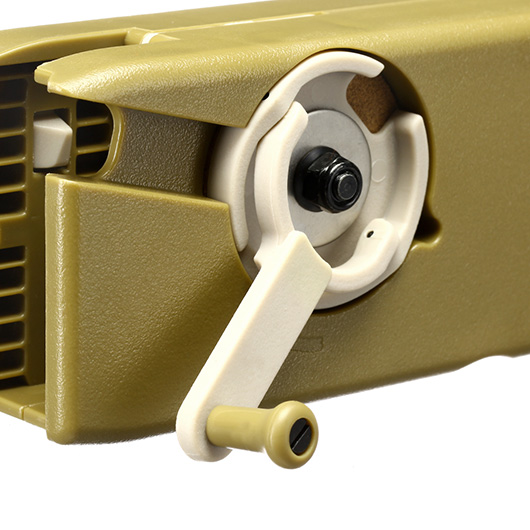Der M12 Sidewinder Speedloader von Odin Innovations ist ein wichtiger Ausrüstungsgegenstand für den professionellen Airsoftspieler und kommt hier in der EMG Collaboration Edition, bei der bereits der vorteilhafte Sound Buffer ab Werk eingebaut ist. Mithilfe der seitlich angebrachten Kurbel können sämtliche Tokyo Marui kompatible M4 / M16 Mid-Cap Magazine in weniger als 5 Sekunden aufgezogen werden. Dank der kompakten Größe passt der M12 Sidewinder perfekt in jede doppelte M4-Magazintasche und kann somit auch im Spielfeld mitgenommen werden. Die große Füllkapazität für bis zu 1300 6mm BB Rundkugeln ermöglicht es ca. zwölf Mid-Cap Magazine zu laden, bevor der Speedloader wieder nachgefüllt werden muss. Das Design kommt nicht von ungefähr, sondern wurde konkret von Airsoftspielern beeinflusst um das maximale herauszuholen.
