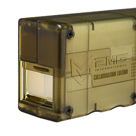 Der M12 Sidewinder Speedloader von Odin Innovations ist ein wichtiger Ausrüstungsgegenstand für den professionellen Airsoftspieler und kommt hier in der EMG Collaboration Edition, bei der bereits der vorteilhafte Sound Buffer ab Werk eingebaut ist. Mithilfe der seitlich angebrachten Kurbel können sämtliche Tokyo Marui kompatible M4 / M16 Mid-Cap Magazine in weniger als 5 Sekunden aufgezogen werden. Dank der kompakten Größe passt der M12 Sidewinder perfekt in jede doppelte M4-Magazintasche und kann somit auch im Spielfeld mitgenommen werden. Die große Füllkapazität für bis zu 1300 6mm BB Rundkugeln ermöglicht es ca. zwölf Mid-Cap Magazine zu laden, bevor der Speedloader wieder nachgefüllt werden muss. Das Design kommt nicht von ungefähr, sondern wurde konkret von Airsoftspielern beeinflusst um das maximale herauszuholen.