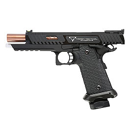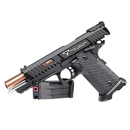 Unsere Airsoftversion wurde aus der Kooperation von EMG, STI und TTI heraus geboren und steht, dank der Verbindung zu den Originalherstellern, der echten Pistole optisch in keinster Weise nach. Da es sich um ein offizielles Lizenzprodukt handelt, wird mit jedem Verkauf der ursprüngliche Designer und Hersteller unterstützt. Wie auch die anderen STI Airsoftreplikas von EMG, ist auch diese Variante hochdetailliert, mit qualitativ hochwertigen Teilen präzise sowie authentisch nachgefertigt und ideal für Sammler oder das heimische Training geeignet. Sehr geringe Toleranzen sorgen dafür, dass das Original hervorragend imitiert wird. Auch die Haptik und das Aussehen sind eins-zu-eins dem Vorbild nachempfunden. Erfahrene Techniker achten beim Zusammenbau und der Abstimmung genau auf die Details, um sicherzustellen, dass nur makellose Pistolen die Fertigung verlassen. Der Abzug ist ultraleicht und lässt sich schnell betätigen. Dies sorgt für eine sehr gutes Zusammenspiel mit der schnellen Performance des Schlittens. Der Polymergriff ist so geformt, dass er der Original-Struktur und - Kontur von STI besonders ähnelt. Das Design des Musters sorgt dabei für einen sehr hohen Komfort und ist unglaublich effizient.