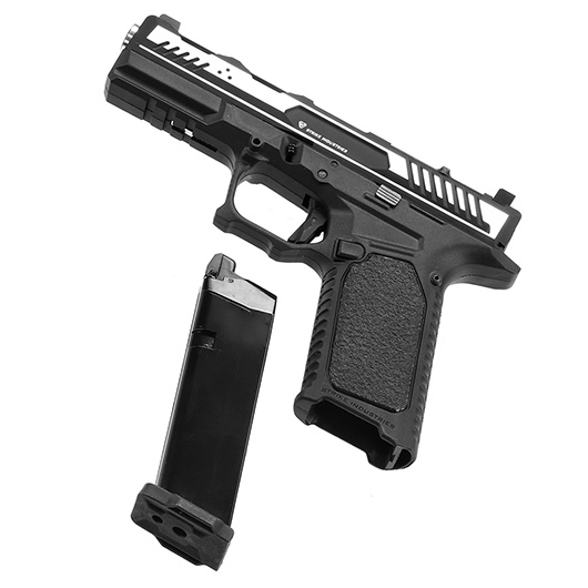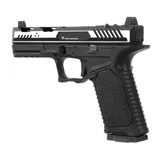 Der moderne Rahmen der Pistole ist authentisch aus Polymer-Verbundkunststoff gefertigt und kommt im lizenzierten Strike Industries Strike 80 C Design. Dank der ergonomischen Formgebung mit rutschhemmenden Strukturierungen im Griffbereich lässt sich die Pistole sehr gut halten. Um Magazinwechsel schnell durchführen zu können, ist die Bodenplatte des Magazins extra breit gestaltet. Eine taktische Underbarrel-Schiene im 21mm Format sorgt für zusätzliche Montagemöglichkeiten. Beide Visiere sind mit weißen Punkten hinterlegt und kommen im erhöhten Design. Hierdurch können die Visiere auch mit einem montierten Silencer weiterverwendet werden. Für die Montage eines Silencers wird noch ein Adapter - z. B. unsere Art.-Nr.: 492411 - benötigt.