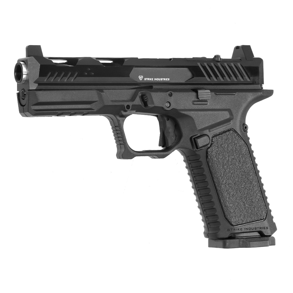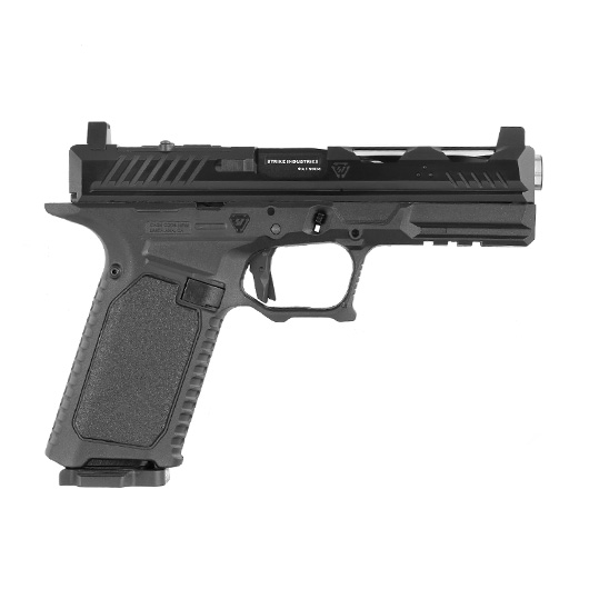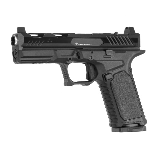 Der moderne Rahmen der Pistole ist authentisch aus Polymer-Verbundkunststoff gefertigt und kommt im lizenzierten Strike Industries Strike 80 C Design. Dank der ergonomischen Formgebung mit rutschhemmenden Strukturierungen im Griffbereich lässt sich die Pistole sehr gut halten. Um Magazinwechsel schnell durchführen zu können, ist die Bodenplatte des Magazins extra breit gestaltet. Eine taktische Underbarrel-Schiene im 21mm Format sorgt für zusätzliche Montagemöglichkeiten. Beide Visiere sind mit weißen Punkten hinterlegt und kommen im erhöhten Design. Hierdurch können die Visiere auch mit einem montierten Silencer weiterverwendet werden. Für die Montage eines Silencers wird noch ein Adapter - z. B. unsere Art.-Nr.: 492411 - benötigt.