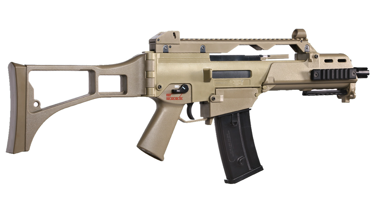 Die Vorderseite des Gewehrs kommt mit einem typischen Gewehr 36C Flash-Hider. Dieser und auch der Außenlauf bestehen aus strapazierfähigem Verbundkunststoff. Auch der Handguard ist aus Verbundkunststoff gefertigt und ist ab Werk mit einer untenliegenden 21mm Aluminium Schiene versehen. Zusätzlich sind im Lieferumfang zwei weitere Aluminium Schienen für die Seiten des Handguards enthalten. An den 21mm Schienen können diverse Zubehörteile (z. B. eine Frontgriff) montiert werden. Der Platz unter dem Handguard dient bei diesem Gewehr als Akkufach. Es können dort bis zu 9.6V NiMH Small-Type / Twin-Type oder baugleiche LiPo Akkus untergebracht werden (nicht enthalten - siehe Zubehör). Der Akkuanschluss ist mit dem gängigen Mini-Tam Stecksystem ausgestattet. Wie bei vielen anderen Airsoftnachbauten diesen Typs, wird für das Öffnen des Akkufachs kein zusätzliches Werkzeug benötigt.