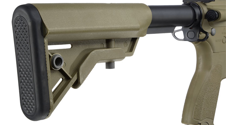 Hinten ist eine Aluminium Schaftröhre mit 6 Einrastpositionen angebracht. Der Schütze hat somit sechs Verstellmöglichkeiten um das Gewehr an seine Bedürfnisse anpassen zu können. Beim Schaft handelt es sich um einen Sopmod Stock mit integrierter Wangenauflage und Schulterauflage aus Gummimaterial. Der Akku wird bei diesem Modell in der Stock-Tube untergebracht. In das Akkufach können sämtliche 7.4V / 11,1V LiPo Stock-Tube Type Akkus mit einer maximalen Länge von ca. 130mm (Durchmesser ca. 25mm) eingelegt werden (nicht enthalten). Das Kabel der Waffe verfügt direkt über einen Standard Mini-Tam Akku-Anschluss.