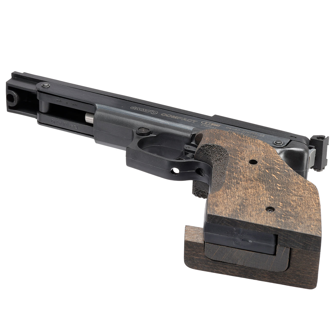 Die Gamo Compact Matchpistole kommt im Kaliber 4,5 mm Diabolo mit gezogenem Präzisionslauf und arbeitet mit vorkomprimierter Luft. Zum Antrieb wird kein weiteres Zubehör benötigt, die Luftpistole ist zudem rückstoßfrei. Der Walnussgriff macht optisch einiges her und verfügt über eine einstellbare Handballenauflage. Je nach Herstellung kann der Farbton des Holzes heller oder dunkler ausfallen, darauf haben wir leider keinen Einfluss.