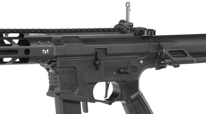 Das ARP 9 in der Version 2.0 besitzt die gleiche Grund-Technologie wie die bereits bekannte ARP 9, wurde allerdings optisch einem Upgrade unterzogen. An der Vorderseite ist dieses Gewehr deshalb mit einem Flash-Hider im MXC9 Design aus Verbundkunststoff ausgestattet. Der einteilige Außenlauf mit 14mm- Linksgewinde ist hingegen aus Aluminium gefertigt und sitzt fest sowie spielfrei am Hauptgehäuse. Über dem Außenlauf befindet sich ein modernes und ebenfalls aus Aluminium gefertigtes M-Lok Rail Schienensystem in der ca. 7 Zoll (ca. 177 mm) Ausführung. Dieses System erlaubt es, diverse M-LOK kompatible Zubehörteile direkt am Handguard per Schnellverschluss zu montieren. Im Lieferumfang enthalten ist für die Montage am Handguard ein M-LOK Polymer Hand Stop. Dieser sorgt für ein sehr gutes Führen des ARP 9 auf dem Spielfeld. Bei der obenliegenden Schiene handelt es sich um eine Standard 21mm Ausführung. Da das M-Lok System exakt am Hauptgehäuse anliegt, verlängert sich die obenliegende Schiene um ca. 177 mm - ideal für die Montage eines Zielgeräts aus dem Zubehörmarkt. Bereits angebracht ist ein höhenverstellbares Flip-Up Frontvisier aus Metall. Alle Teile des Frontsystems sind passgenau gefertigt und fest montiert. Auch die hochwertige Beschichtung der Metallteile vermittelt einen originalgetreuen Eindruck.