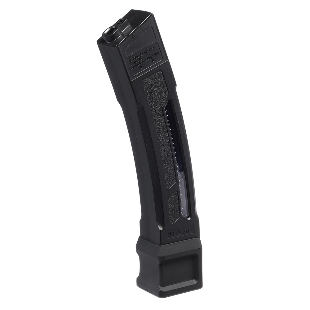 Das optisch ansprechende Design ist weiterhin auf beiden Seiten mit einem transparenten Ausschnitt versehen, durch den die Kugeln im Innern des Magazins eingesehen werden können. Somit kann von außen kontrolliert werden, wieviele Kugeln sich im Magazin noch befinden.