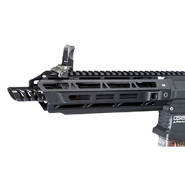 Die Vorderseite ist dieses Gewehr mit einem passenden Aluminium Flash-Hider ausgestattet. Der einteilige Aluminium Außenlauf sowie der dekorative Gas-Block mit Tube sind fest und spielfrei am Hauptgehäuse montiert. Über dem Außenlauf befindet sich das moderne G&G M-LOK Rail VIII Schienensystem in der ca. 8,5 Zoll (ca. 215 mm) Ausführung. Dieses System erlaubt es, diverse Zubehörteile direkt am Handguard zu montieren. Es gibt somit keine leeren bzw. nicht benutzten Schienen mehr, die bei herkömmlichen Handguards häufig störend waren. Beim M-LOK System werden die vom Schützen benötigten Zubehörteile direkt am Handguard per Schnellverschluss befestigt. Bei der obenliegende Schiene handelt es sich um eine Standard 21mm Ausführung. Da das M-LOK System exakt am Hauptgehäuse anliegt, verlängert sich die obeliegende Schiene um ca. 200 mm - ideal für die Montage eine Zielgeräts oder einer Zielgerät-Combo aus dem Zubehörmarkt. Bereits angebracht ist ein höhenverstellbares Flip-Up Frontvisier aus Metall. Alle Teile des Frontsystems sind passgenau gefertigt und fest montiert. Auch die hochwertige Beschichtung der Metallteile vermittelt einen originalgetreuen Eindruck.