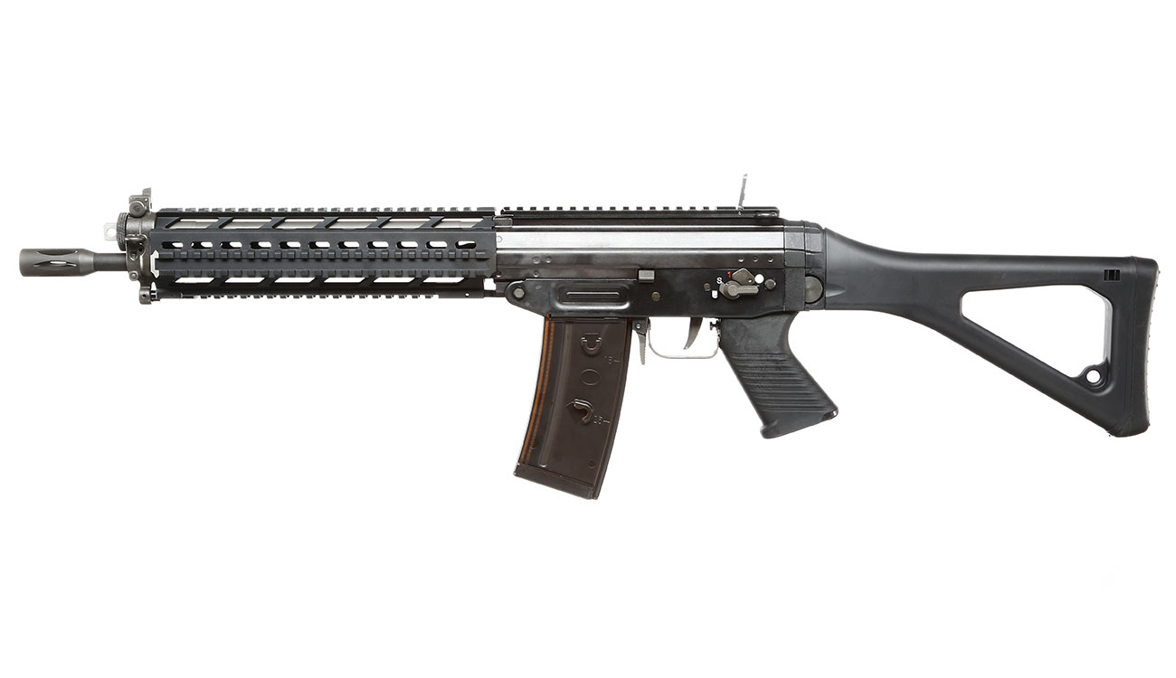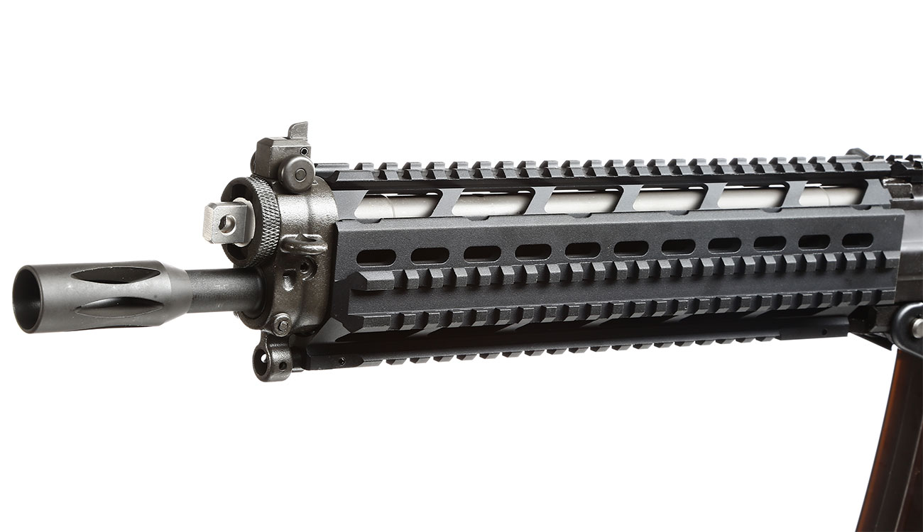 Vorne ist das Gewehr mit einem authentischen Flash-Hider aus Stahl ausgestattet. Auch der einteilige Außenlauf mit Deko-Gasbabnahme sowie das klappbare Frontvisier sind aus diesem originalgetreuen Material gefertigt. Das Frontvisier kann, wie beim echten Gewehr, zusätzlich auch seitlich verstellt werden. Dahinter ist der Handguard montiert. Anstatt des bekannten Modells aus Polymer-Verbundkunststoff wurde bei dieser Tactical-Version ein RIS-System aus Aluminium angebracht. Dieses ist mit vier 21 mm Schienen ausgestattet wodurch diverse Zubehörteile montiert werden können. Abgenommen werden kann das System werkzeuglos mittels eines Schnellwechsel-Stahlstifts.