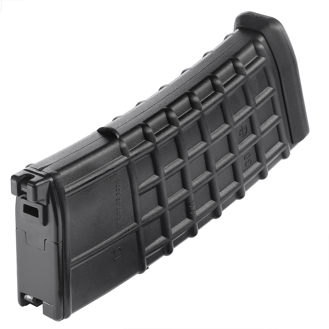 Das Magazin fasst 30 6mm BB Kugeln besitzt Platz für eine 12g CO2 Kapsel. Die Kapsel wird von unten in das Magazin gesteckt. Um einen originalgetreuen Eindruck zu erwecken ist die Hülle aus Polymer-Verbundkunststoff gefertigt.