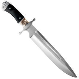 Ein mit 27 Zentimeter langer und 4 Millimeter dicker Klinge beeindruckendes Bowiemesser ist das Jackson's Bowie der Marke Haller. Die schwarzen Pakkaholzgriffschalen wurden mit Einlagen aus Hirschhorn ergänzt und wirken in Kombination mit 440er rostfreiem Edelstahl schlicht und elegant. Durch die zusätzlichen Hirschhornapplikationen wird der Naturbezug des robusten, für Jagd- und Fischereizwecke geeigneten Messers unterstrichen.