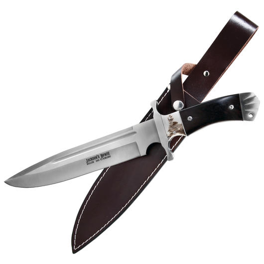 Das Messer liegt mit einem Eigengewicht von 570 Gramm gut in der Hand und ist auch für alle anderen Arten von Outdoorabenteuern geeignet. Die zugehörige dunkelbraune Lederscheide ist wie das Messer ebenso massiv und aus 3 Millimeter dickem Leder hergestellt. Sie besitzt ein Druckknopfband für den sicheren Halt des Jackson's Bowiemessers und ebenso eine Gürtelschlaufe zum Anbringen des Messers an entsprechenden Stellen. An einer Griffbohrung kann ein Fangriemen angebracht werden.