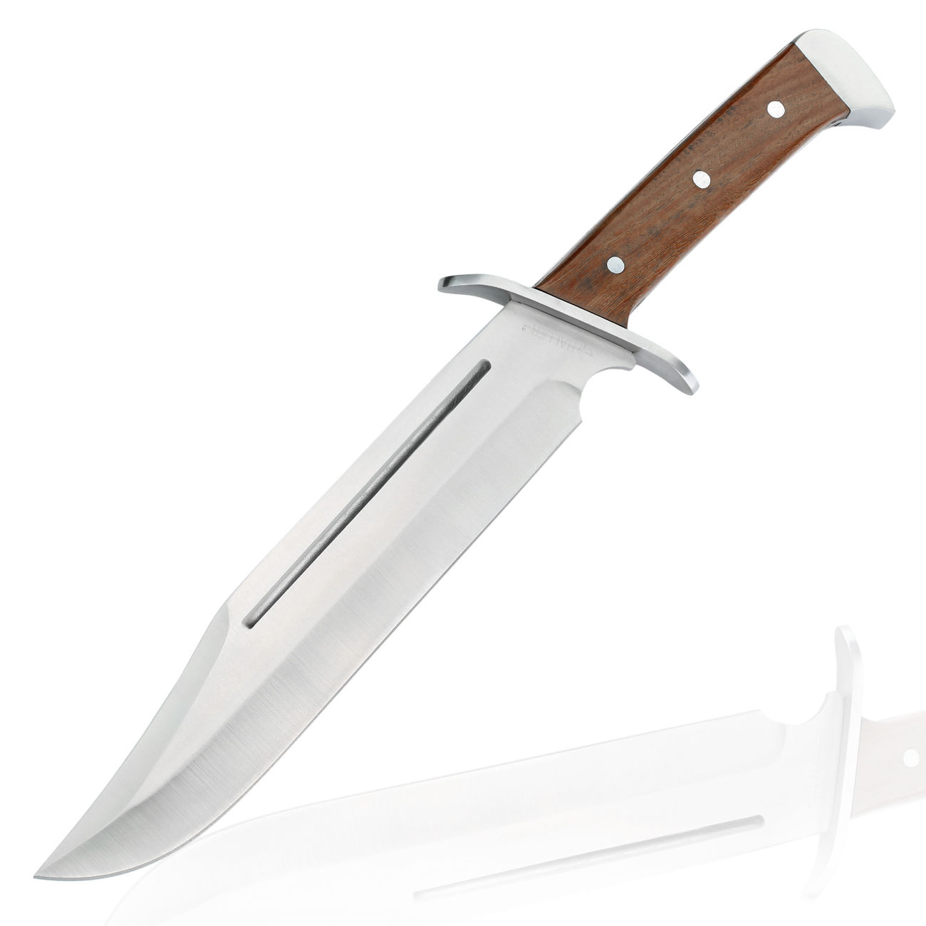 Das Bowiemesser Master aus dem Hause Haller ist ein kräftiges Bowiemesser mit einer ca. 25,5 cm langen Klinge welche aus 420 rostfreiem Stahl besteht. Der Griff des Messers wurde aus Pakkaholz gefertigt. Damit liegt das Bowie gut in der Hand. Für die Parierstange und dem Endknauf wurde rostfreier Stahl verwendet.