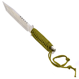 Preisgünstiges Outdoormesser mit durchgehender Tantoklinge aus rostfreiem 420 Stahl. Die Klinge ist mit Ätzungen im Stile einer Damastklinge versehen. Das Griffstück ist mit Kordel umwickelt, die im Notfall abgewickelt werden kann.