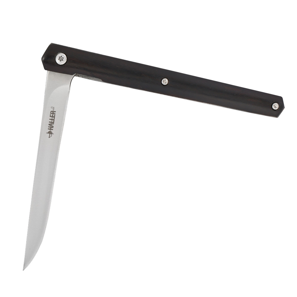 Das super schlanke Haller Einhandmesser Slim kommt mit kugelgelagertem Flipper. Die Klinge besteht aus satiniertem, rostfreiem 440er Stahl und wird sicher arretiert mit dem bekannten Liner-Lock System.
