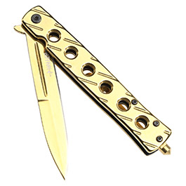 Das Einhandmesser Stiletto gold von Haller besticht durch seine komplette goldfarbene Beschichtung. Es ist ein kräftiges Messer, aber dennoch handlich im Umgang.
