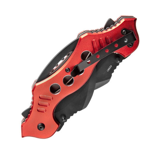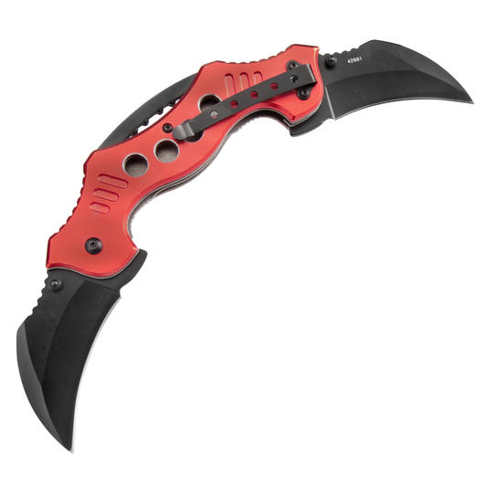 Dieses sehr ausgefallene und robuste Einhandmesser Claw von Haller verfügt über zwei Klingen, welche sich per Einhandpin öffnen lassen. Die Klingen sind aus 420 rostfreiem Stahl und schwarz beschichtet. Die Arretierung erfolgt klassisch mittels Liner-Lock. Die rote Griffbeschalung ist aus Leichtmetall und hat auf der Rückseite einen Gürtelclip.