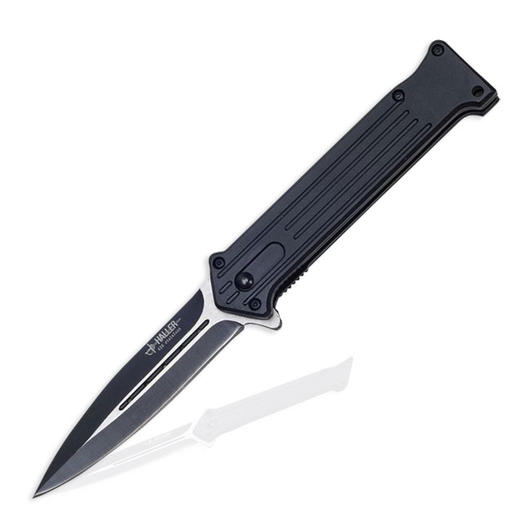 Dieses Haller Einhandtaschenmesser in Stilettoform ist durch seine teilweise schwarz beschichtete Klinge mit dekorativen Bohrungen besonders interessant. Die Klinge ist aus 420 rostfreiem Stahl und am Klingenrücken nicht geschliffen. Die Arretierung der Klinge erfolgt mittels Liner-Lock. Die Griffbeschalung besteht aus Leichtmetall und besitzt einen Befestigungsclip.