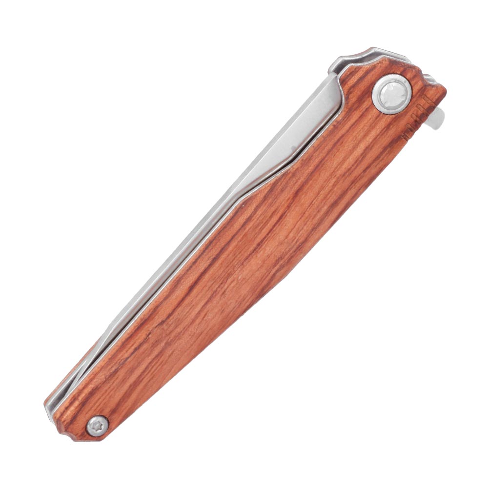 Das Haller Select Einhandmesser kommt mit Holzgriffschalen und einer rostfreien 440er Stahlklinge. Geöffnet wird bei diesem optisch sehr schönen Messer per kugelgelagertem Flipper mit einer Hand.