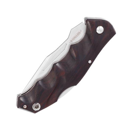 Die verschraubten Holzgriffschalen aus dunklem Ebenholz sind sehr gut verarbeitet und liegen dank ergonomischen Design gut in der Hand. Eine öse am Griffende ermöglicht zusätzlich die Befestigung einer Fangschnur.