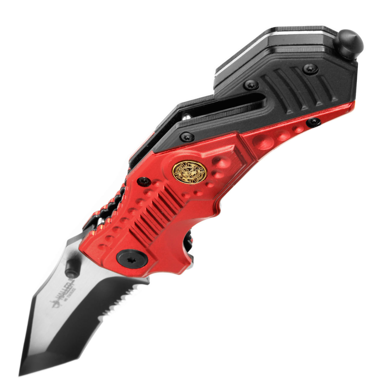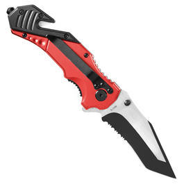 Die Klinge des in der Signalfarbe Rot gehaltenen Rettungsmessers VI Red der Marke Haller ist teilweise schwarz beschichtet und verleiht dem Messer eine interessante Optik. In die roten Leichtmetallgriffschalen ist ein Fire Department-Emblem eingelassen. Dieses Messer kann sowohl in Notsituationen, aber auch bei allen anderen alltäglichen Anforderungen gute Dienste leisten.