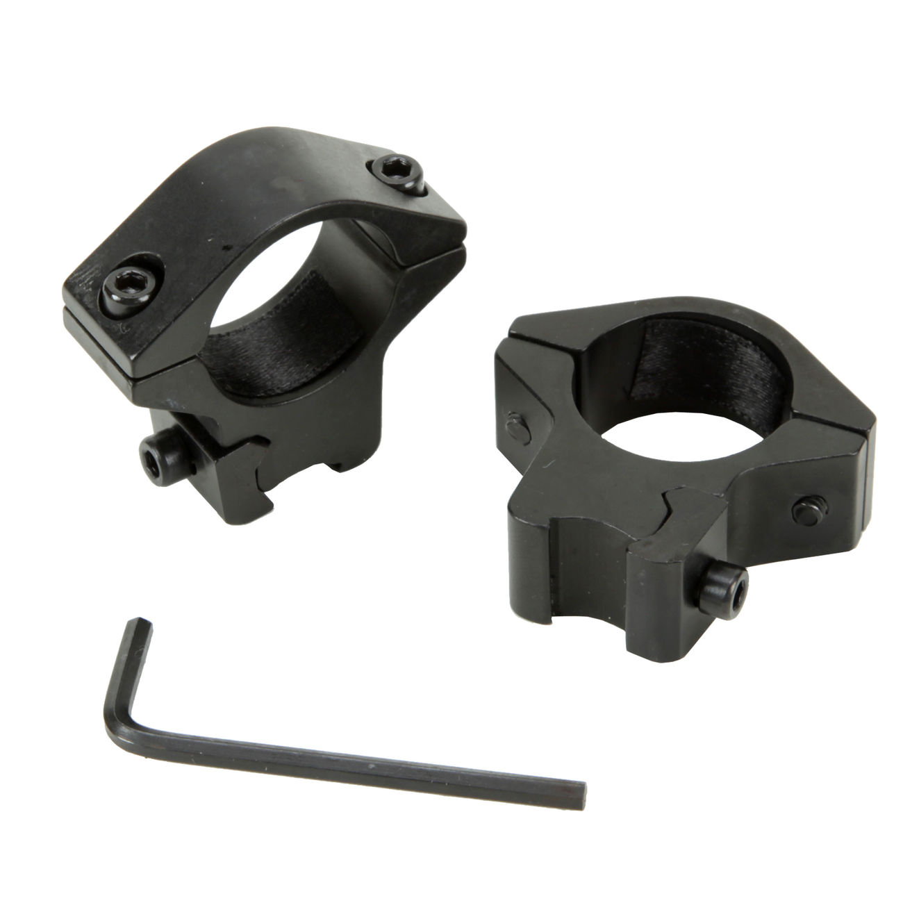 Halteringe mit einem Rohrdurchmesser von 1 Zoll für Optiken und Zielfernrohre aus schwarz eloxiertem Metall.
