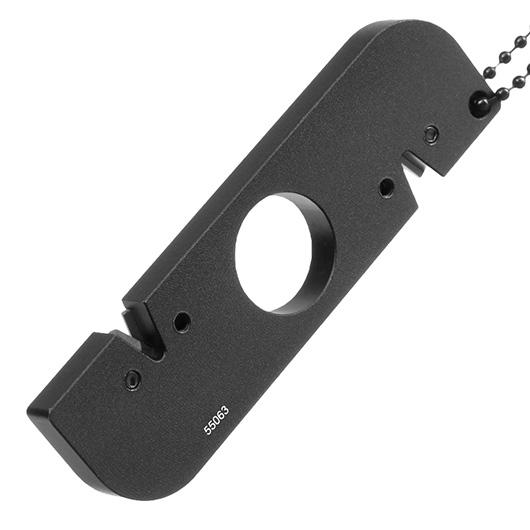 Der Profi Messerschärfer von Herbertz ist durch seine größe dein perfekter Begleider bei Outdooreinsätze. Er verfügt über zwei Winkeleinsätze aus Wolfram-Carbit mit 33 und 40 Grad. Das mattschwarze Gehäuse besteht aus einer Aluminiumlegierung und besitzt in der Mitte ein rundes Fingerloch zum sicheren Festhalten des Schärfers.