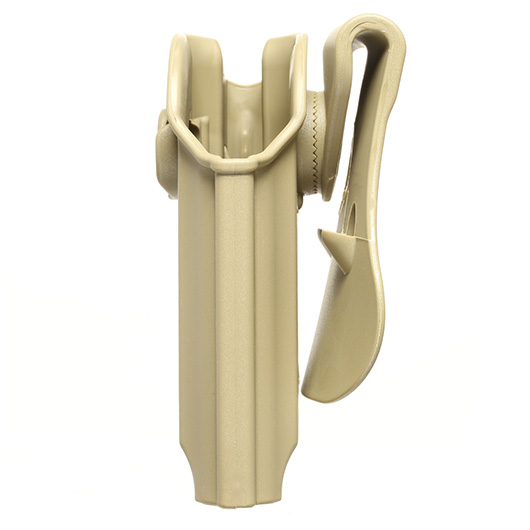 Durch das Roto-Retention System kann das Holster zudem einfach beliebig um 360 Grad gedreht und wieder fixiert werden. Dazu muss nur mit einem Innensechskantschlüssel (mitgeliefert) das Holster gelöst werden. Dieses geschieht durch eine Schraube, die durch die Öffnung des Arretierungsknopfes erreicht werden kann. Darunter kommt dann das Roto-Retention System hervor, durch dieses das Holster gedreht, oder auch an anderen zusätzlich verfügbaren Plattformen (separat erhältlich, siehe passendes Zubehör) angebracht werden.