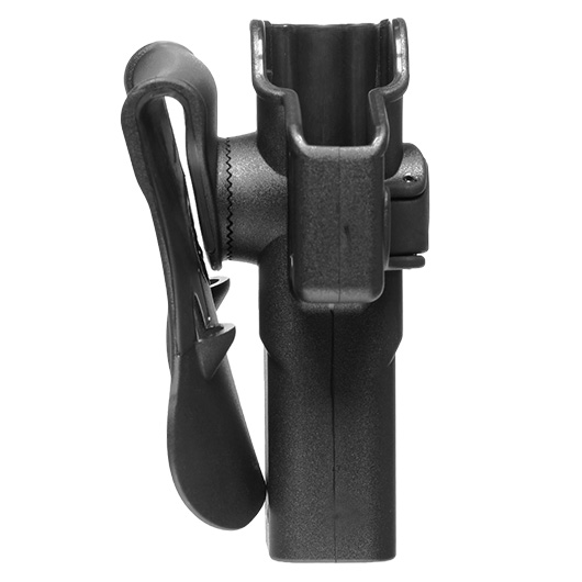 Durch das Roto-Retention System kann das Holster zudem einfach beliebig um 360 Grad gedreht und wieder fixiert werden. Dazu muss nur mit einem Innensechskantschlüssel (mitgeliefert) das Holster gelöst werden. Dieses geschieht durch eine Schraube, die durch die Öffnung des Arretierungsknopfes erreicht werden kann. Darunter kommt dann das Roto-Retention System hervor, durch dieses das Holster gedreht, oder auch an anderen zusätzlich verfügbaren Plattformen (separat erhältlich, siehe passendes Zubehör) angebracht werden.