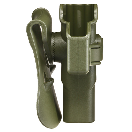 Durch das Roto-Retention System kann das Holster zudem einfach beliebig um 360 Grad gedreht und wieder fixiert werden. Dazu muss nur mit einem Innensechskantschlüssel (mitgeliefert) das Holster gelöst werden. Dieses geschieht durch eine Schraube, die durch die Öffnung des Arretierungsknopfes erreicht werden kann. Darunter kommt dann das Roto-Retention System hervor, durch dieses das Holster gedreht, oder auch an anderen zusätzlich verfügbaren Plattformen (separat erhältlich, siehe passendes Zubehör) angebracht werden.