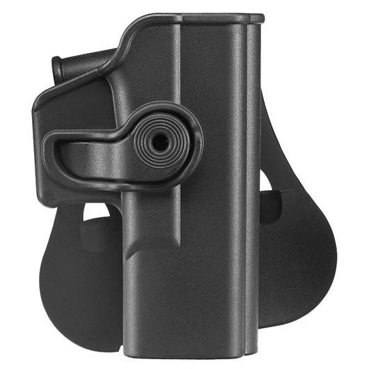 Durch das Roto-Retention System kann das Holster zudem einfach beliebig um 360 Grad gedreht und wieder fixiert werden. Dazu muss nur mit einem Innensechskantschlüssel (mitgeliefert) das Holster gelöst werden. Dieses geschieht durch eine Schraube, die durch die Öffnung des Arretierungsknopfes erreicht werden kann. Darunter kommt dann das Roto-Retention System hervor, durch dieses das Holster gedreht, oder auch an anderen zusätzlich verfügbaren Plattformen (separat erhältlich, siehe passendes Zubehör) angebracht werden.