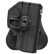 Durch das Roto-Retention System kann das Holster zudem einfach beliebig um 360 Grad gedreht und wieder fixiert werden. Dazu muss nur mit einem Innensechskantschlüssel (mitgeliefert) das Holster gelöst werden. Dieses geschieht durch eine Schraube, die durch die Öffnung des Arretierungsknopfes erreicht werden kann. Darunter kommt dann das Roto-Retention System hervor, durch dieses das Holster gedreht, oder auch an anderen zusätzlich verfügbaren Plattformen (separat erhältlich, siehe passendes Zubehör) angebracht werden.
